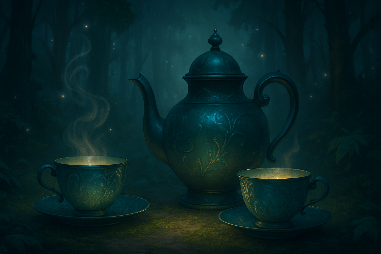 In the heart of the twilight forest, where moonlight dances on leaves and secrets steep in silence, an enchanted tea set waits—steeped in old magic. This design captures the quiet rituals of fae realms and shadowed glens, where each sip tells a story and every glow holds a spell.